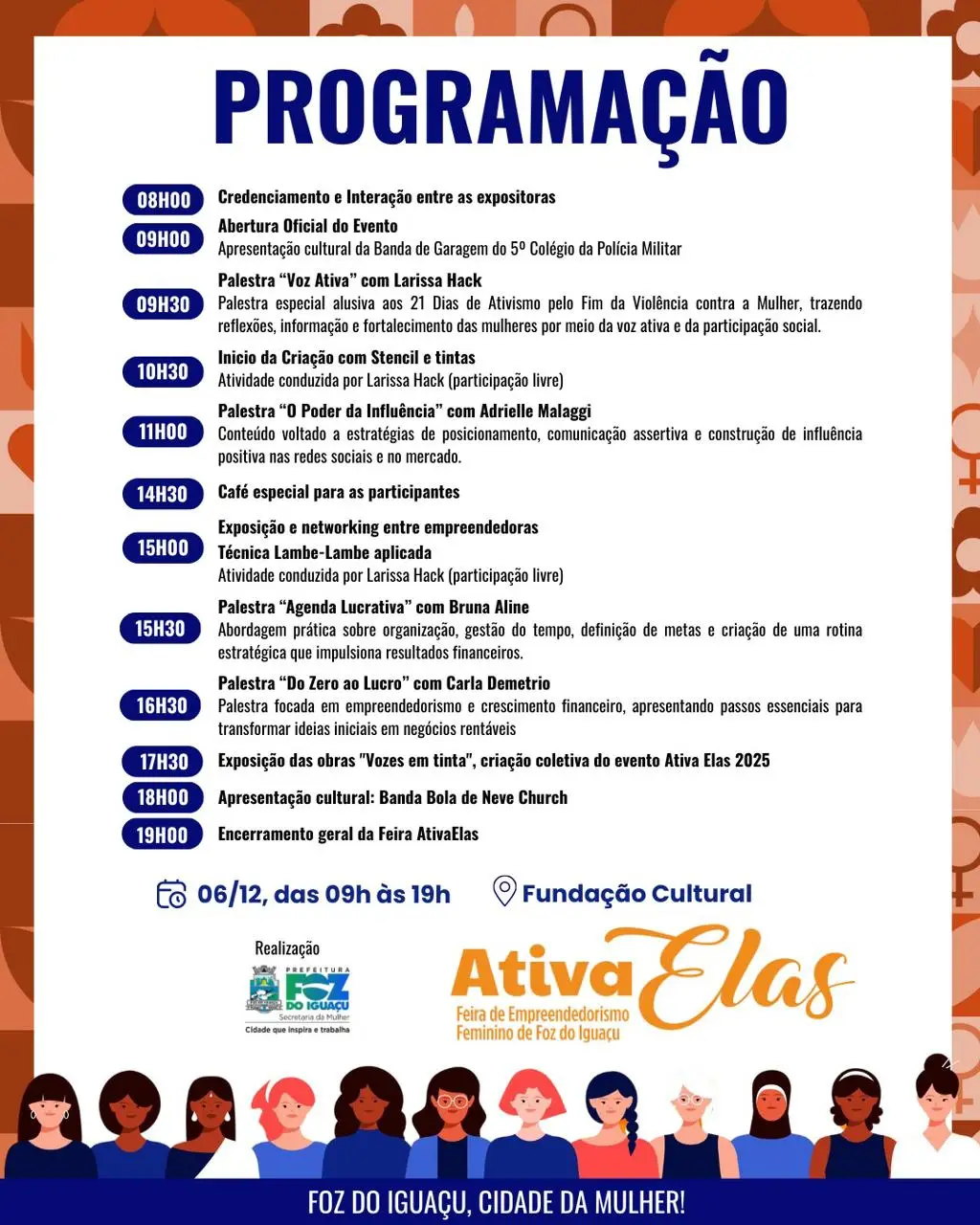 No dia 06 de dezembro, das 9h às 19h, Foz do Iguaçu será palco de um dos eventos mais inspiradores do ano: o Ativa Elas – Feira de Empreendedorismo Feminino. Promovido pela Secretaria da Mulher, liderada por Scheila Melo, o encontro será realizado na Fundação Cultural, Rua Benjamin Constant, 62.