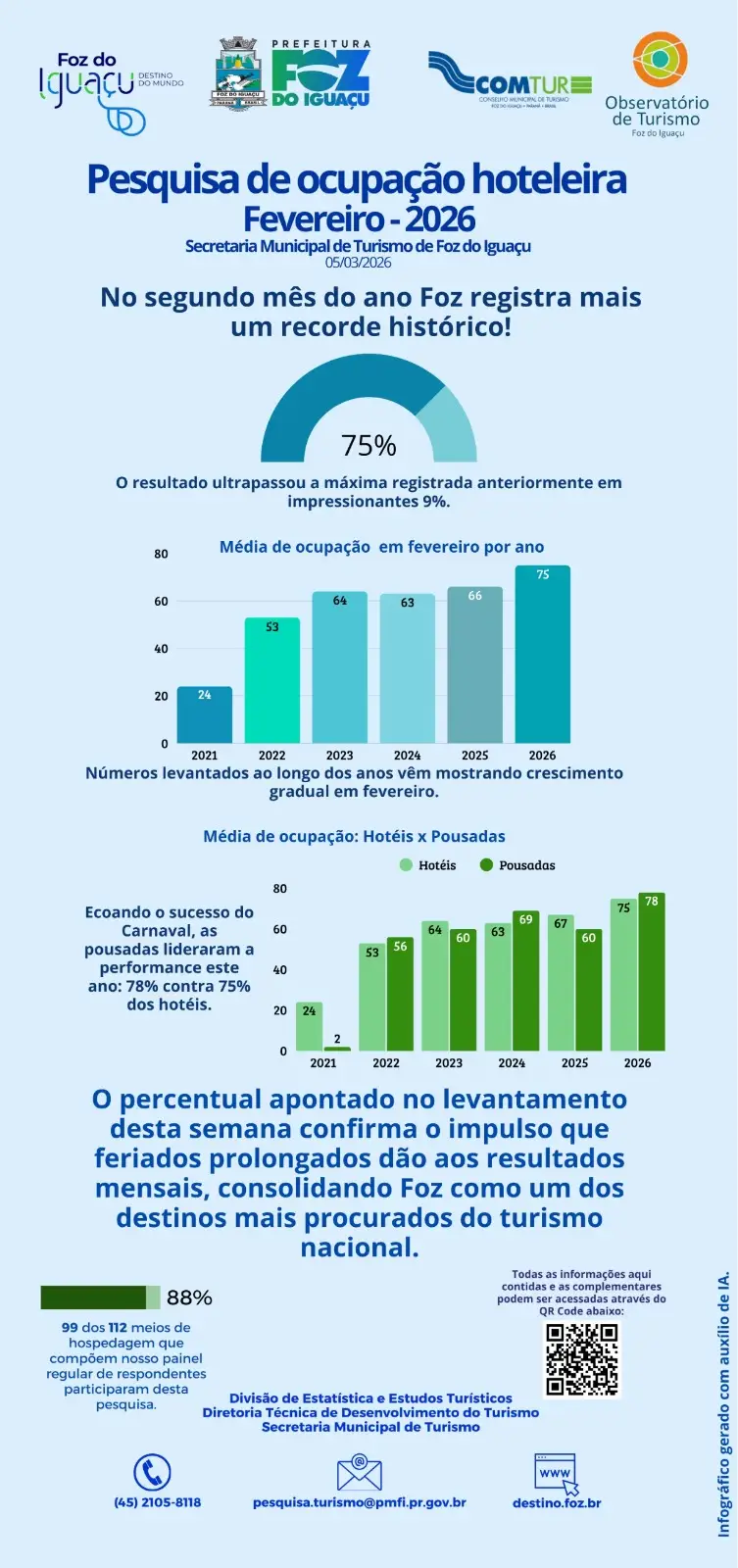 Ela acrescenta: “Observamos que, mesmo após o pico do Carnaval, as pousadas sustentaram uma performance de 78%, o que também demonstra a diversidade e a força de todos os segmentos da nossa hotelaria. Esse resultado coloca Foz do Iguaçu como uma escolha prioritária no cenário nacional e nos dá uma base sólida para o planejamento das próximas ações da Secretaria”, afirma Sheila Domingues.