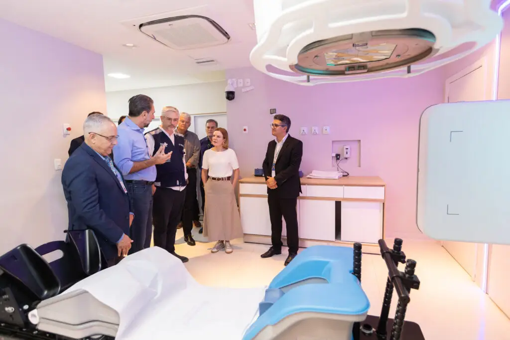 O roteiro interno iniciou pela entrada principal do hospital, seguindo pela ala de internação obstétrica. Na sequência, a comitiva visitou as obras do novo Centro de Material e Esterilização (CME) e percorreu os corredores da unidade até o setor de oncologia. No local, conheceram o acelerador linear de partículas, equipamento de última geração utilizado em tratamentos de radioterapia. A agenda foi finalizada na recepção da oncologia.
